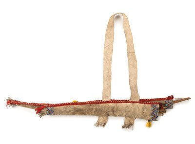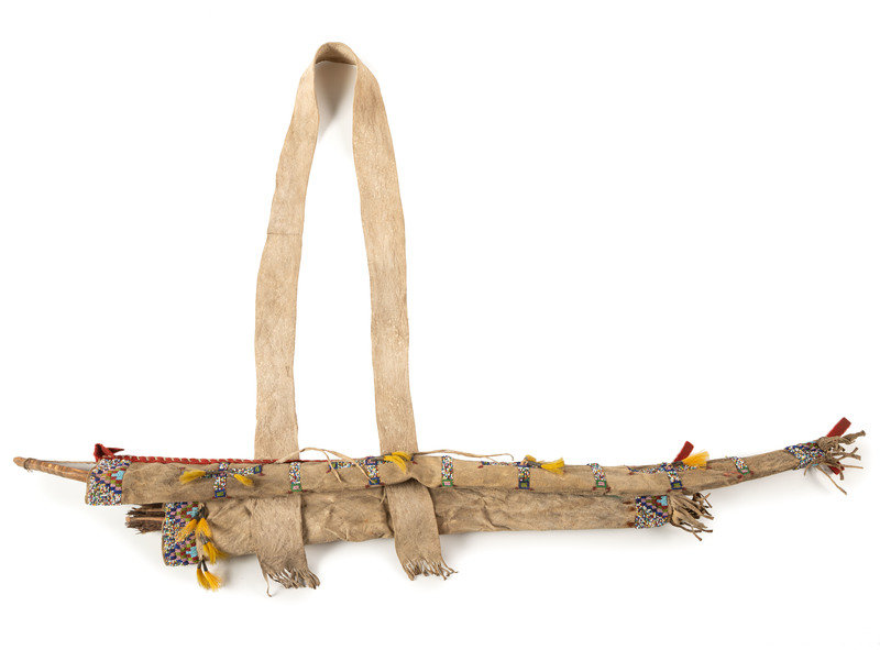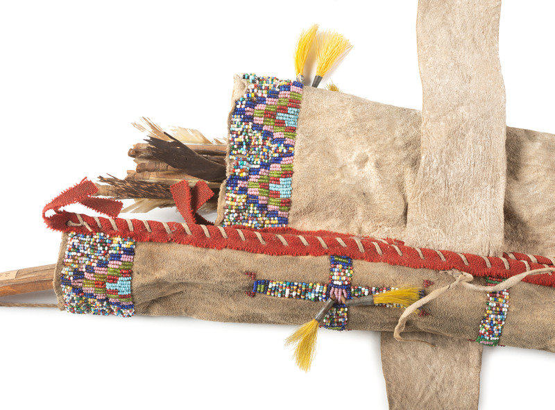 thread and sinew-sewn; bowcase and quiver decorated with salt and pepper beadwork and embellished with red trade wool