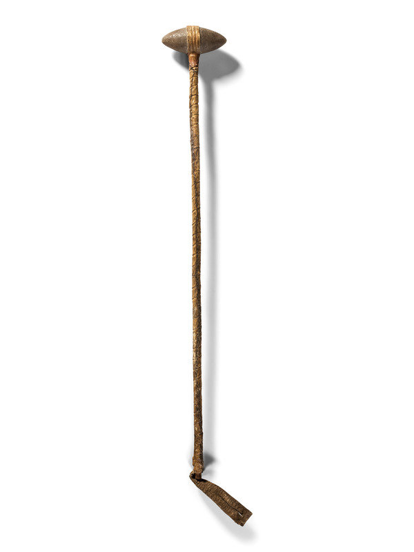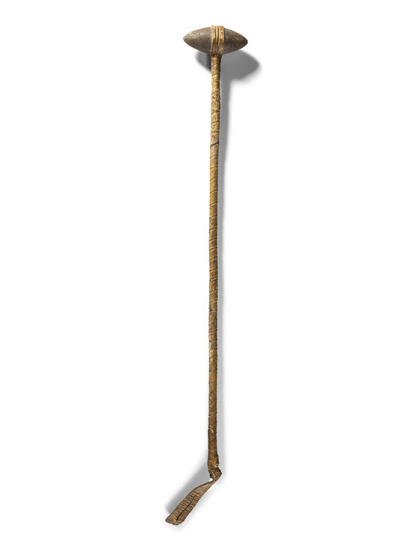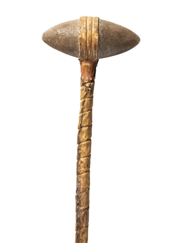 small biconical head attached to a long handle wrapped with buffalo hide; remnants of red pigment