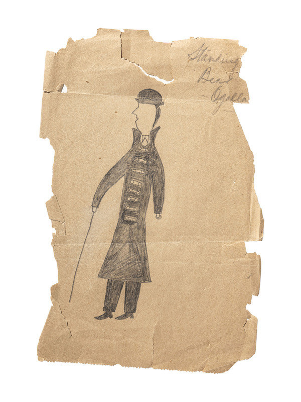 drawn with graphite pencil on thin unlined paper; depicting a well-dressed man wearing a bow tie, long coat, and trousers; cane in hand; the figure has his hair cut short and under a cap; inscribed upper right corner Standing Bear - Ogalla