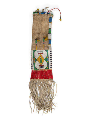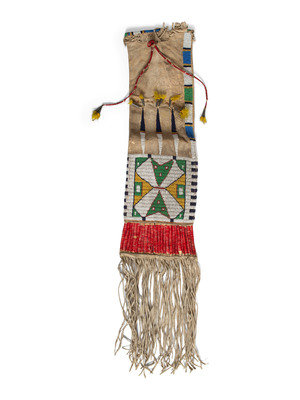 sinew-sewn and beaded using colors of cobalt, red white-heart, greasy yellow, pea green, light blue, and white; embellished with tin cones and yellow-dyed feathers