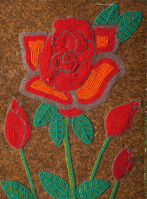 a single-sided purse also designed with a rose, using real size glass and cut beads, back made of hide, interior lined with cotton