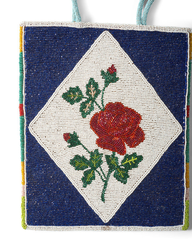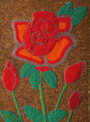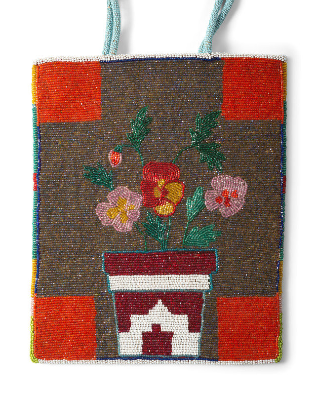 a double-sided purse designed using cut beads to illustrate potted primroses on one side and a red rose on opposite