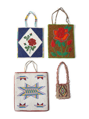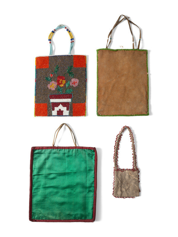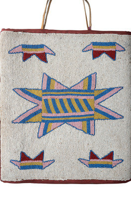 a small hide pouch with one side beaded in red white-heart, dark blue, pink, yellow, and white