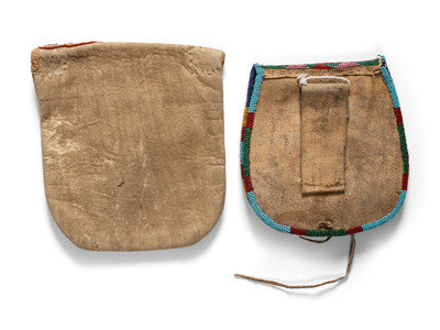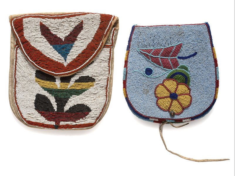an Apsáalooke beaded hide bag, thread-sewn and beaded in colors of red white-heart, white, greasy yellow, cobalt, white, and rose; interior lined in polished cotton and with inscription, To Erin / From Lyde