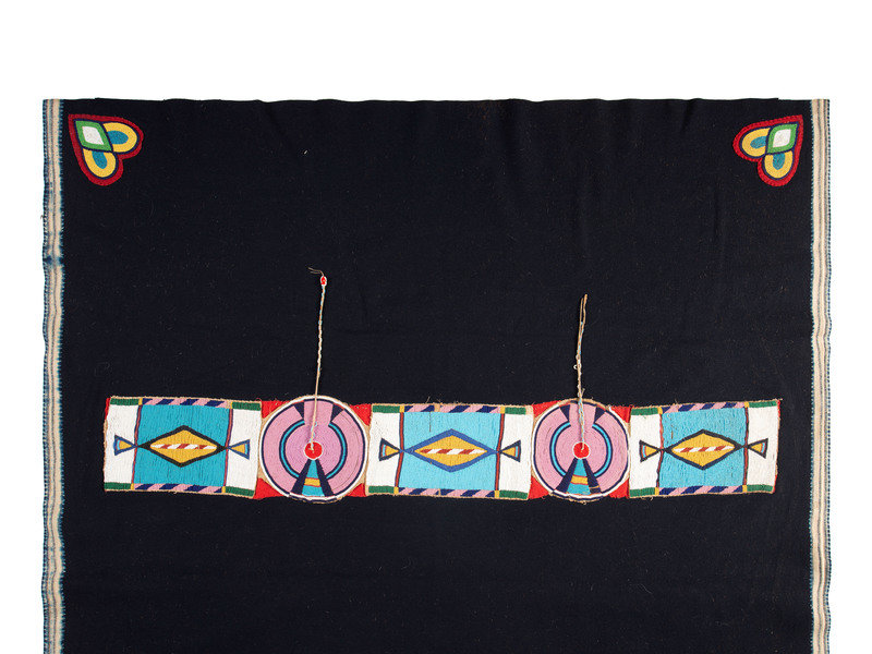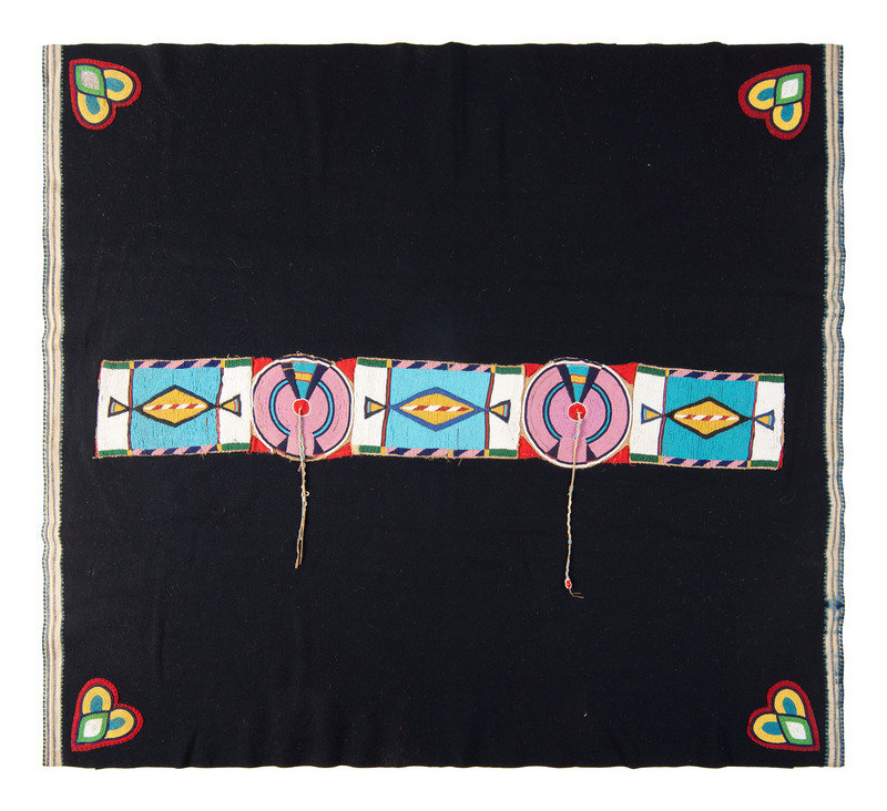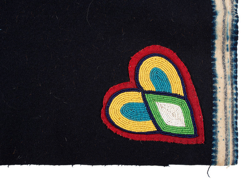 thread and sinew-sewn; trimmed blanket strip is beaded using colors of light blue, pink, greasy yellow, cobalt, red white-heart, pink, translucent green, and white; corners of navy wool blanket are further embellished with hearts and red trade cloth
