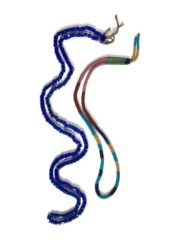 a necklace constructed of bead-wrapped fabric cord AND a long strand of Russian facetted cobalt beads