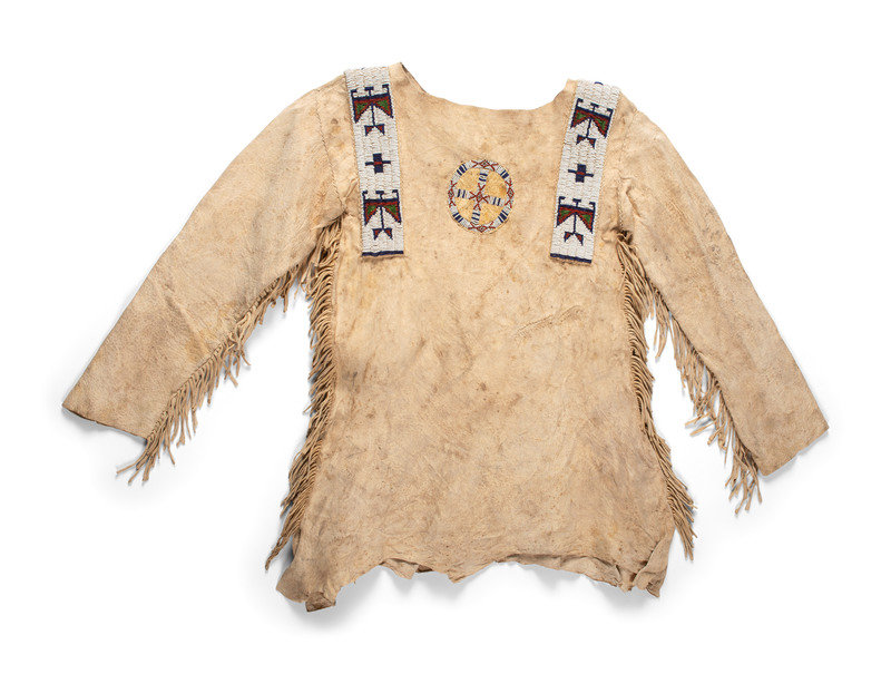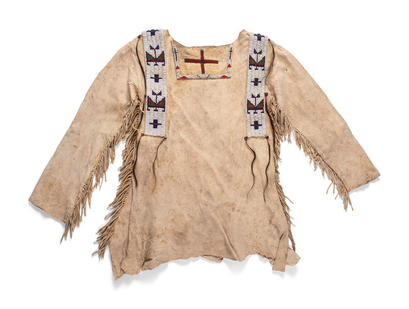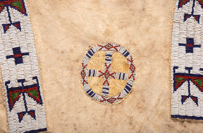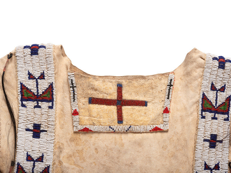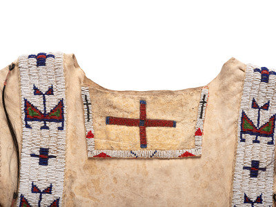thread and sinew-sewn; strips on shoulders are beaded in colors of rose, translucent green, cobalt, and white; rectangular bib with cross; beaded medallion on back; hairlock embellishments