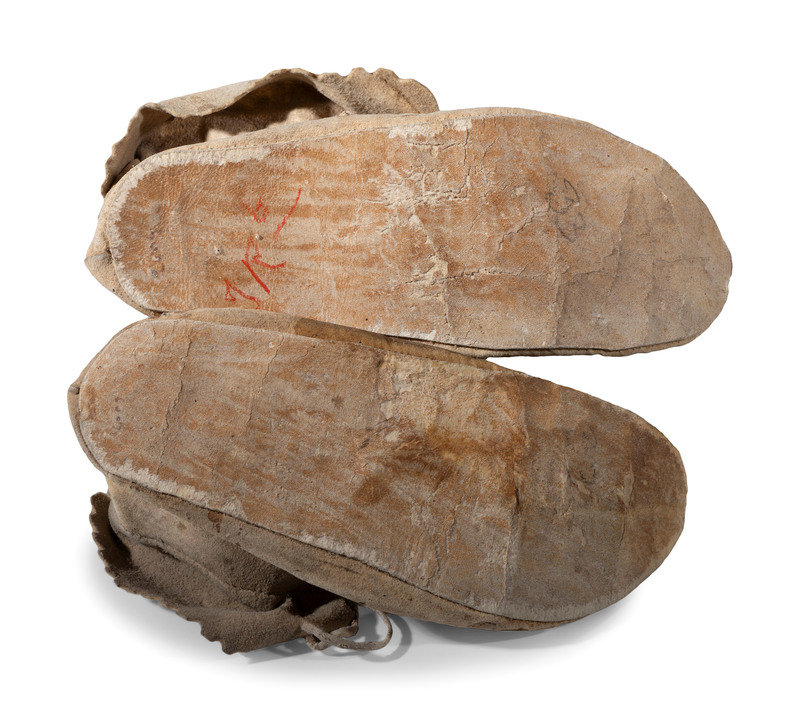 thread and sinew-sewn; vamps beaded using colors of red white-heart, amber, pea green, light blue, greasy yellow, and cobalt creating an eagle surrounded by delicate florals; pinked cuffs