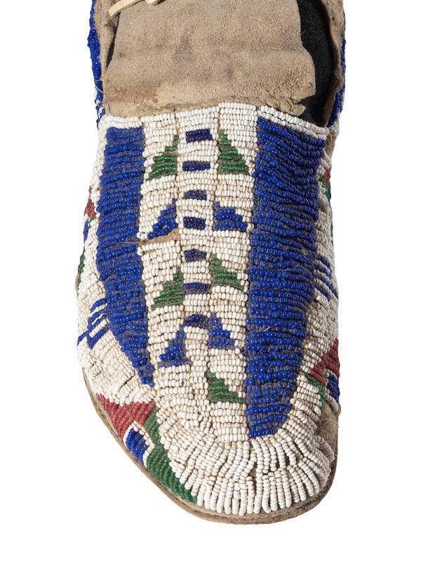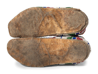 thread and sinew-sewn; having vamps beaded in dark blue, white, red white-heart, and translucent green; cuffs edged with patterned cotton
