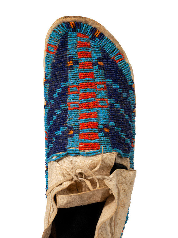 sinew-sewn and beaded in colors of red, and dark and medium blue