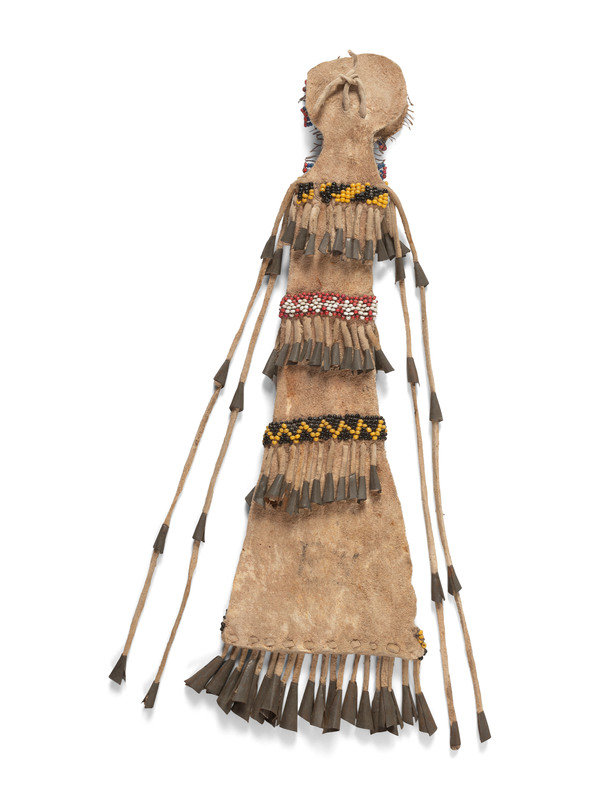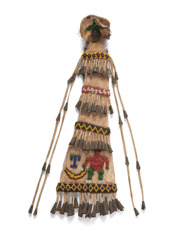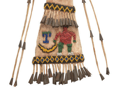 thread-sewn and decorated using both seed and real beads in colors of white, translucent green, red white-heart, dark blue, black, and greasy yellow; lower tab with net-stitched figure and the letter T