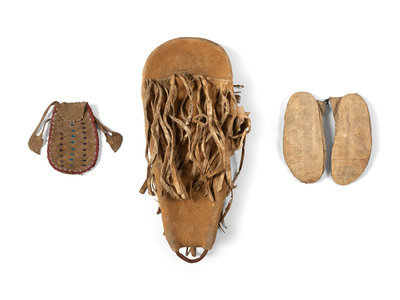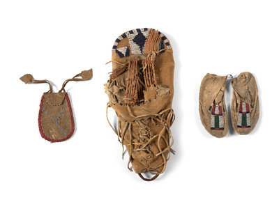 Paiute Doll Cradle, Apsáalooke [Crow] Child's Moccasins, and Beaded Pouch