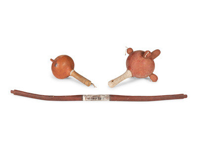 two gourd rattles, one in the form of a Koyemsi