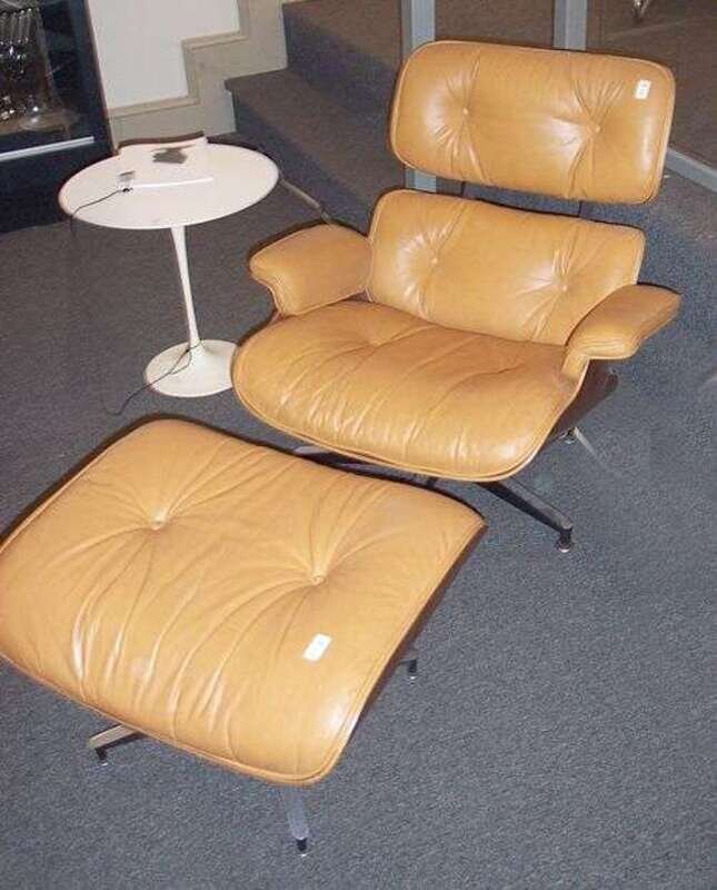 Rosewood, leather, aluminum; butterscotch leather, labels underneath seats. Chair H: 31 1/2, W: 32 in.; ottoman H: 17, L: 25, W: 21 in.