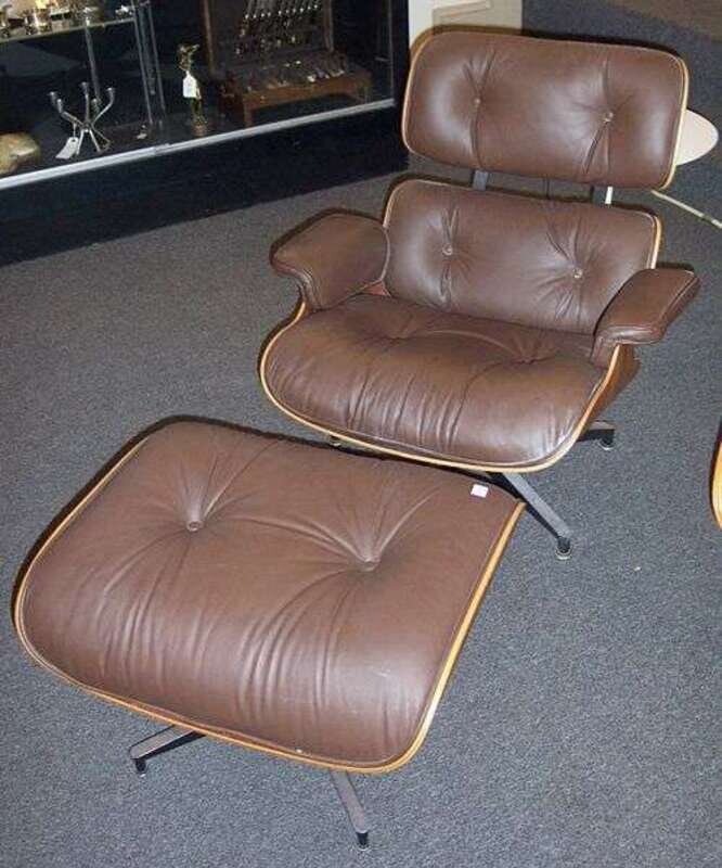 Rosewood, leather, aluminum; chocolate brown leather, labels under seats. Chair H: 1 1/2, W: 32 in.; ottoman H: 17, L: 25, W: 21 in.