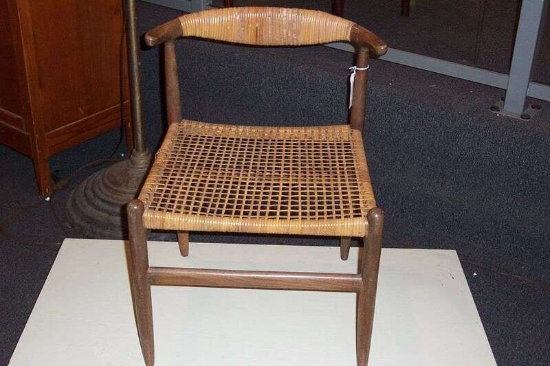 Teak, caning; a few breaks to caning, branded marks, H: 30, W: 25, D: 21 in. Note: The generous proportions, spare cane work and overall construction indicate this may be a prototype study of Wegner's classic.