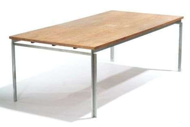 Steel oak, marble; added green marble (3/4 in.) atop original oak. H: 27 in. (sans marble), L: 80 in., W: 40 in. (Marble top not shown.).