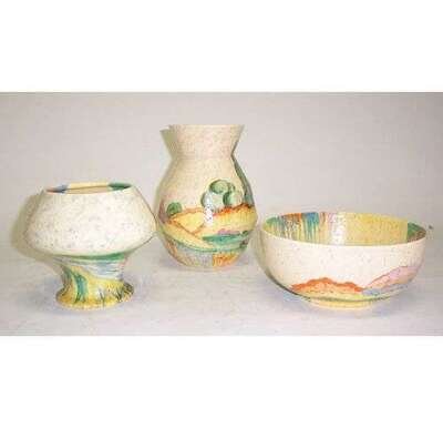 Painted, glazed and textured ceramic; two vases and one bowl. (3). Hts: 5 1/3, 8; bowl Dia: 7 3/4 in.