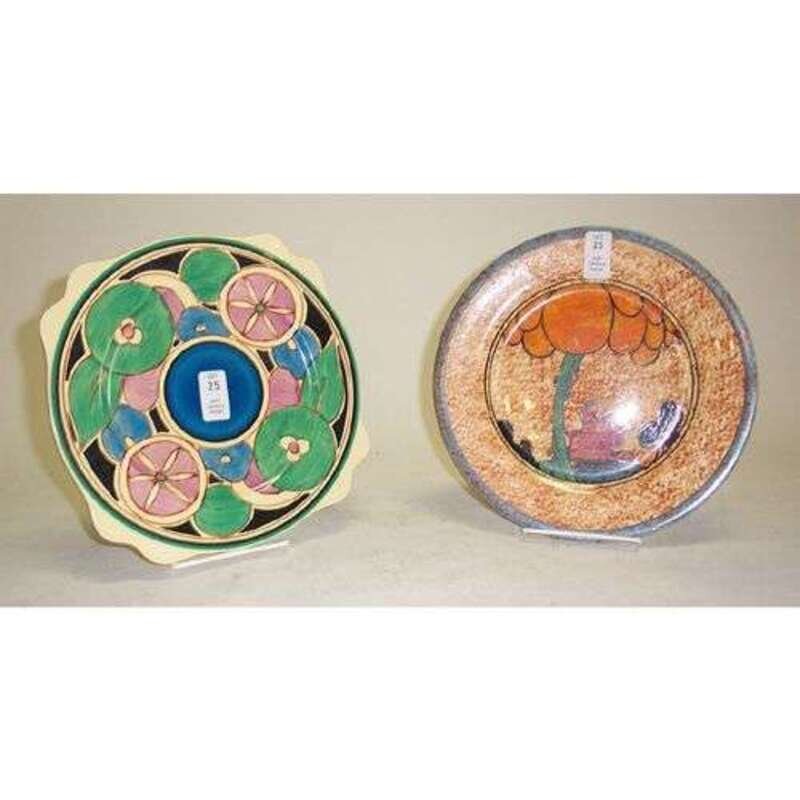 Painted & glazed ceramic; one "sliced fruit," the other cafe au lait "Summerhouse." Dias: 10 1/2, 10 in.