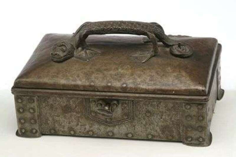 Wrought iron; stamped with "FW" cipher and "GERMANY," retains original hand-wrought key. H: 5 1/2, L: 11, W: 7 1/2 in.