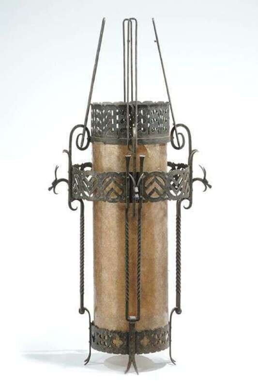 Wrought iron, mica; with three 34-inch hanging rods, electrified. Lantern alone H: 62, Dia: 29 in.