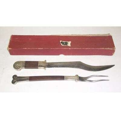 940 silver, hardwood, steel; fork stamped "940 HA TAXCO" and 9 bell mark, carving knife stamped on blade, "TAXCO HA MADE IN MEXICO," in original red cardboard box labeled "Taller Borda Taxco, Gro." Fork L: 13 1/2, knife L: 15 1.4 in.
