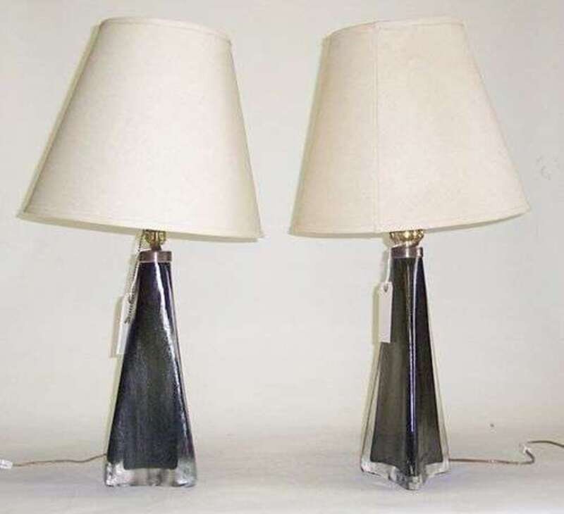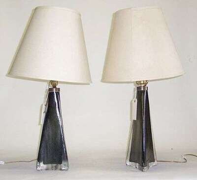 Blown glass; each engraved "Orrefors" to base and brass cap stamped "ORREFORS." Base H: 14 1/2 in.