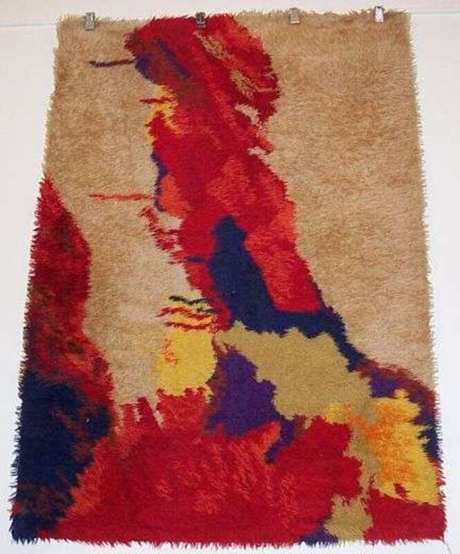 Wool pile; labeled with title "Jays Inferno" from Concepts International Design Studio (NYC), made in England. 4 1/2 x 6 1/2 ft.