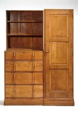 Oak; includes chest of drawers, bookcase and wardrobe, retailed by Heal's. H: 79, W: 57 3/4, D: 22 1/2 in.
