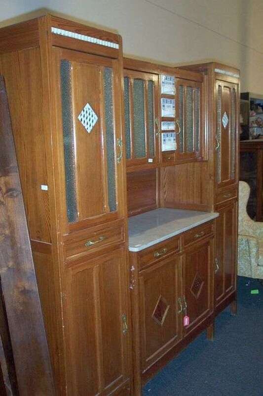 Fir, glazed ceramic, glass, brass; ceramic drawers marked Villeroy & Boch. H: 82 1/2, W: 79, D: 19 in.