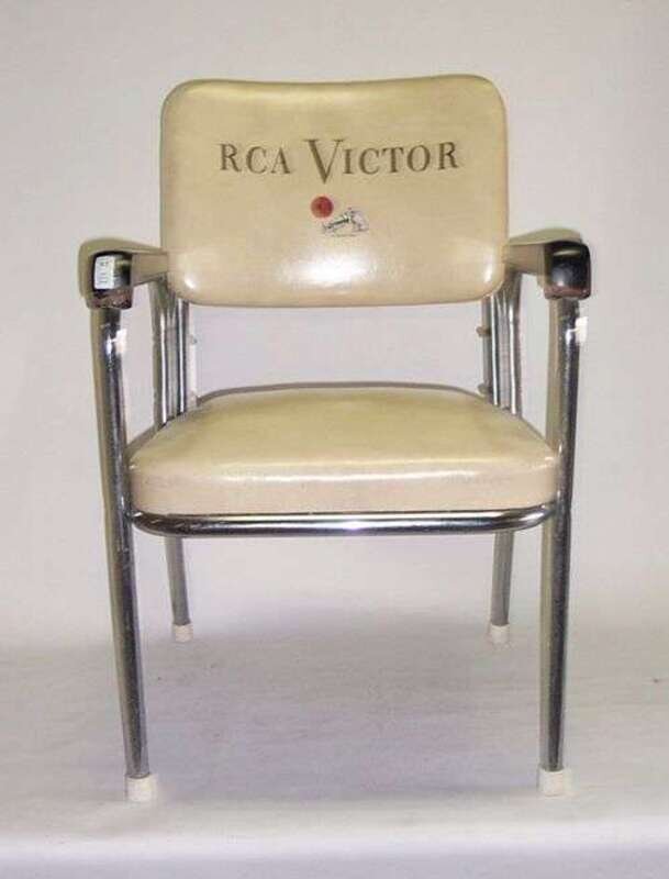 Chromium, vinyl, wood; original RCA advertising upholstery. It is thought that a small number of these chairs were made and sold to RCA distributors for their showrooms. H: 32, W: 22, D: 26 in.