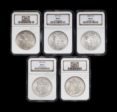comprising: 1878-S, 1879-S, 1880-S, 1881-S and 1882-S examples.