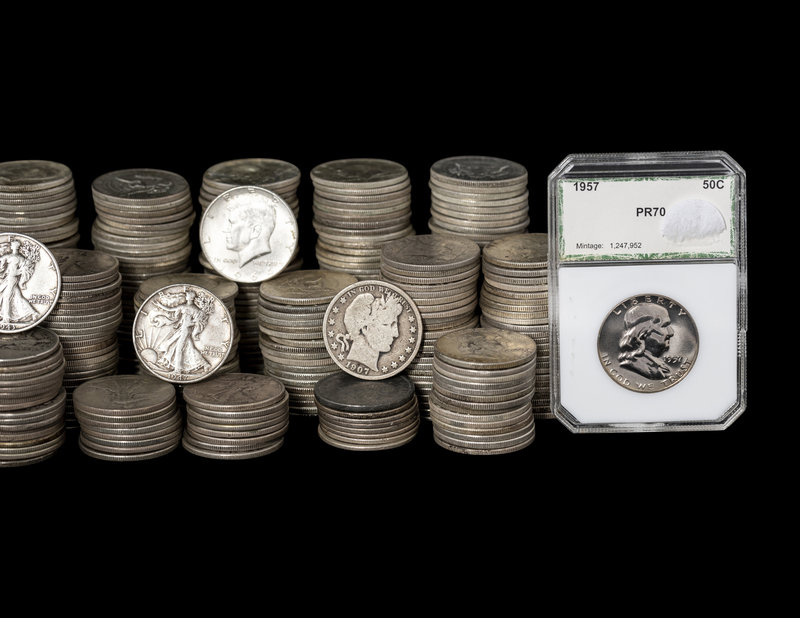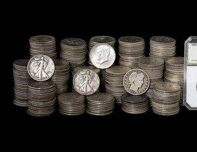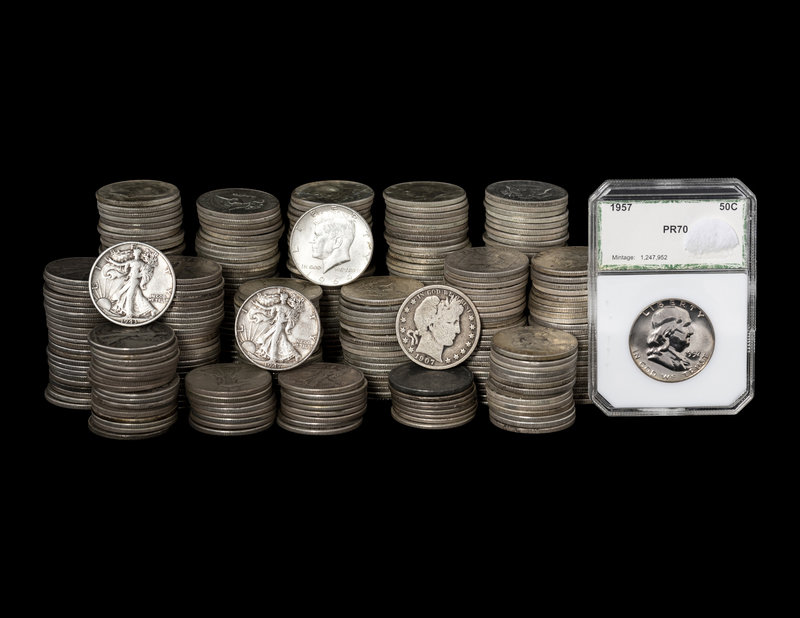 comprising: Barber (x9), Walking Liberty (x84), Benjamin Franklin (x62), 1964 John F. Kennedy (x192) and a 1957 Benjamin Franklin proof; 348 coins total.