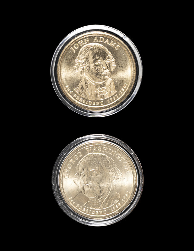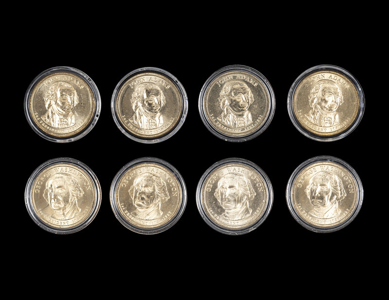 comprising two George Washington 'No Motto' and two John Adam 'Double Edge Letter-Overlap' examples, each with a correctly minted example; eight coins total.