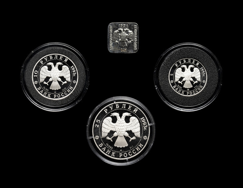 comprising: a 5 Rouble (7.78 gr), 10 Rouble (15.55 gr) and 25 Rouble (31.1 Rouble) example.
