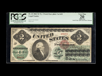 A Series 1862 $2: Type II Legal Tender Note [Fr. 41] (PCGS VF20 Apparent; Edge Splits and Minor Damage)