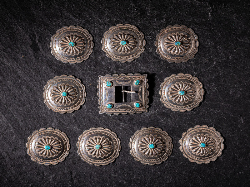 Navajo Silver and Turquoise Conchas and Belt Buckle