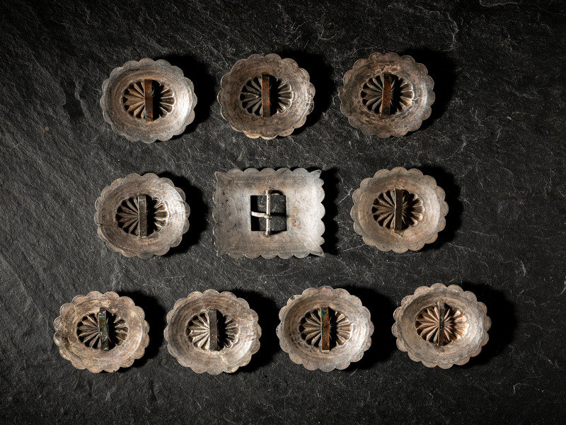 nine oval conchas, each with stamped scalloped edges and a repoussé design radiating from the central turquoise cabochon; with matching rectangular buckle; not marked