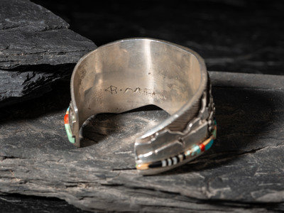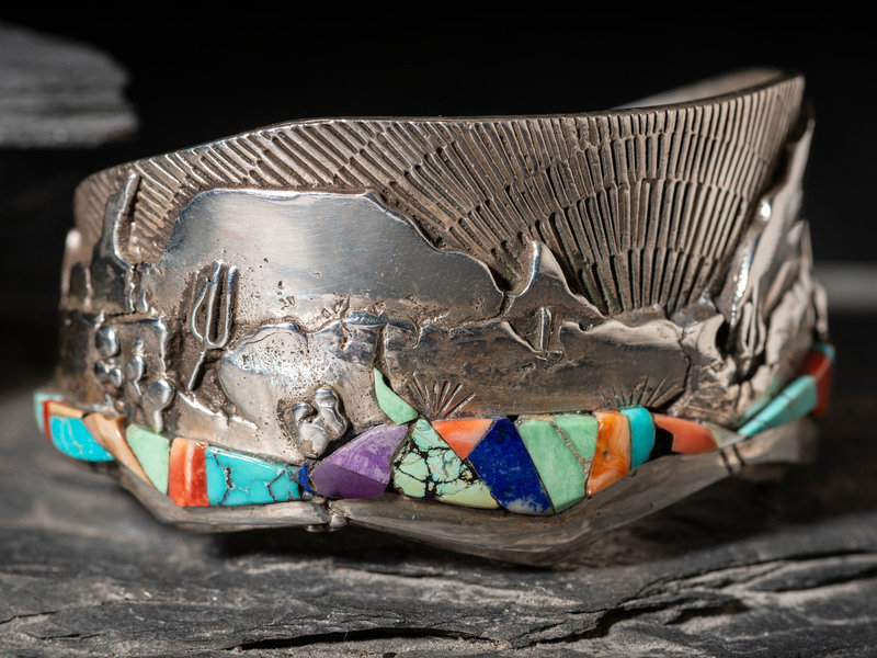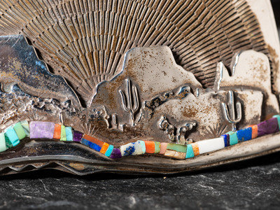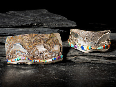 lot of 2, each set with a colorful row of mosaic inlay accentuating a desert landscape; both signed D ROMERO; sizes include:
