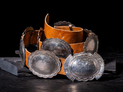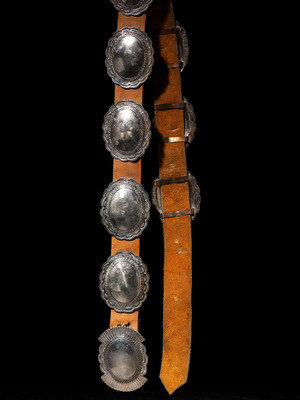 belt length 42 inches x width 1-1/2 inches, concha length 3 inches x width 2-1/2 inches, buckle length 3-1/2 inches x width 2-1/2 inches, total weight 272.3 dwt.