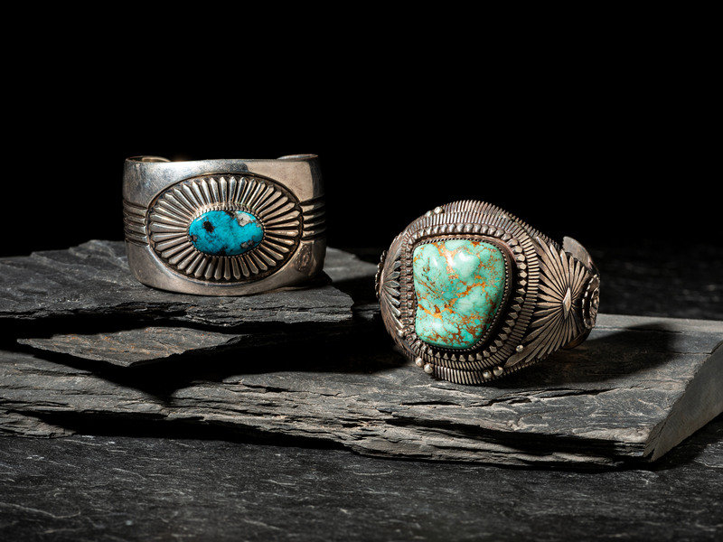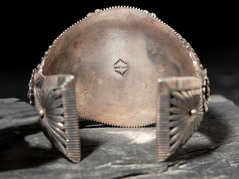 one with a tapered shank and heavily embellished with cast and silver appliqué designs; set with a single turquoise nugget; signed EDDY CHACO