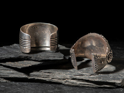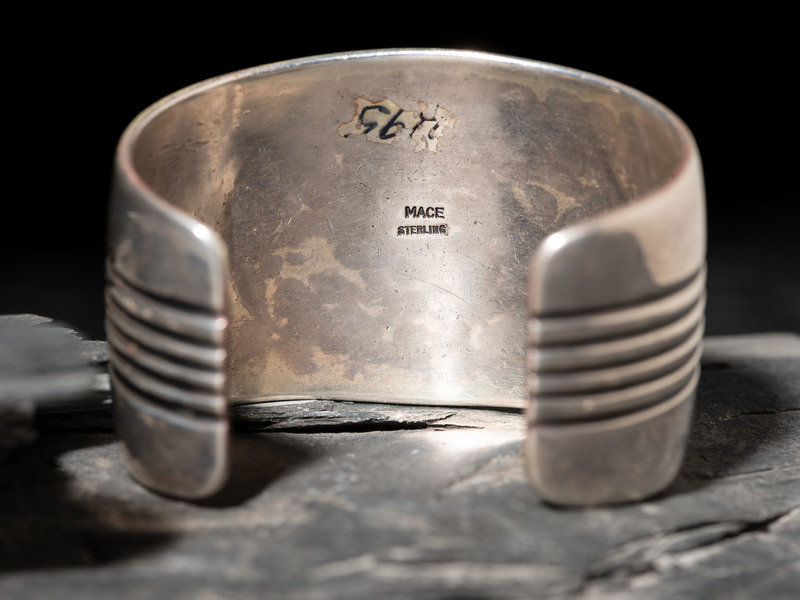 the other, set with a single turquoise cabochon with radiating repeating feather design; signed MACE and marked STERLING