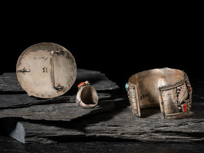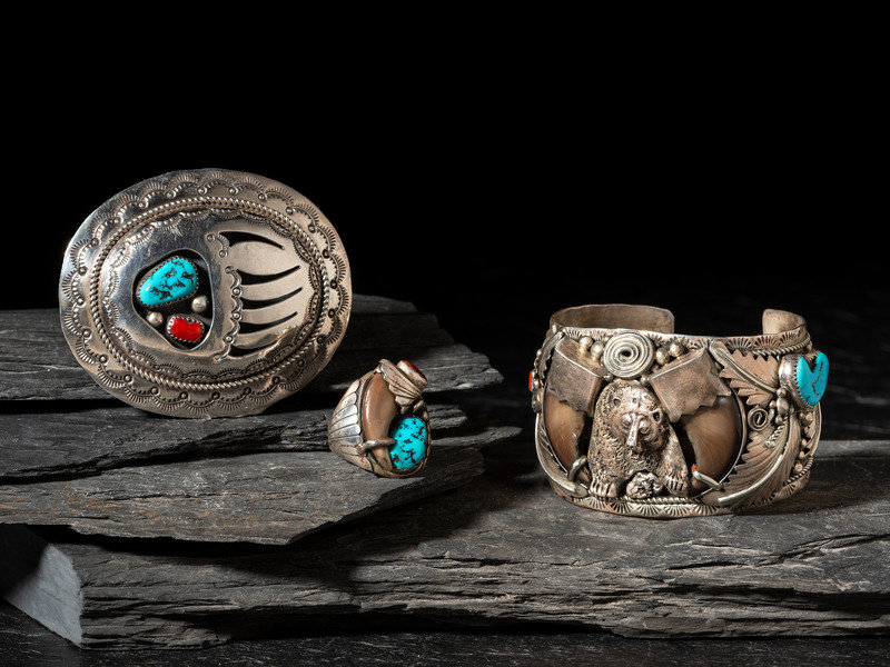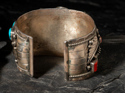 a cuff with bear and leaf silver appliqué, accented by claws, turquoise, and coral; marked BE STERLING