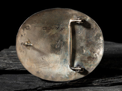 a stamped oval belt buckle with shadow box paw print housing a piece of turquoise and coral; marked M.M. STERLING