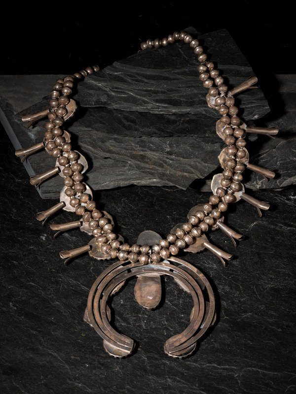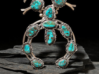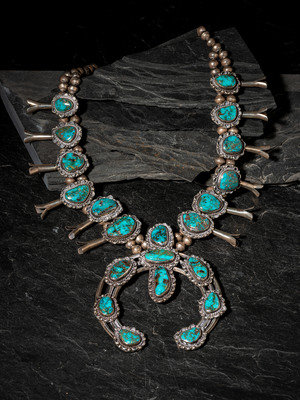with large wire naja set with nine turquoise cabochons, surrounded by twelve graduated squash blossoms; not marked