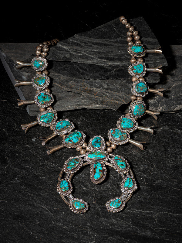 Navajo Silver and Turquoise Squash Blossom Necklace