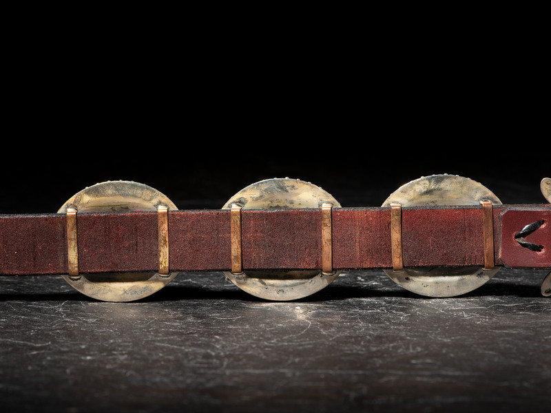 belt length 48-3/4 inches x width 1-1/4 inches, concha length 3 inches x width 2-1/2 inches, buckle length 3-3/8 inches x width 2-5/8 inches, total weight 486.6 dwt.