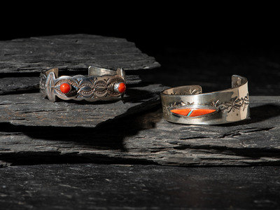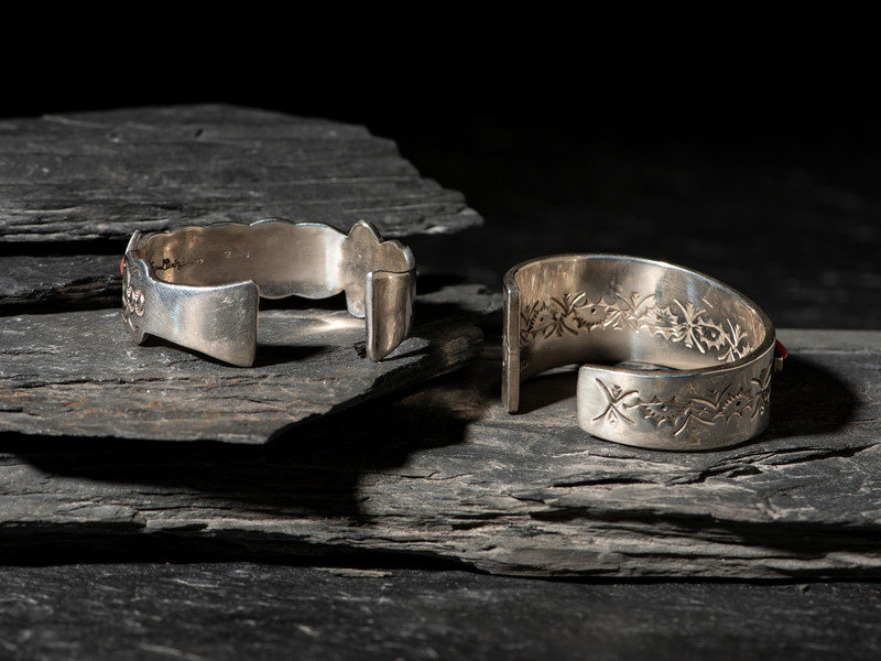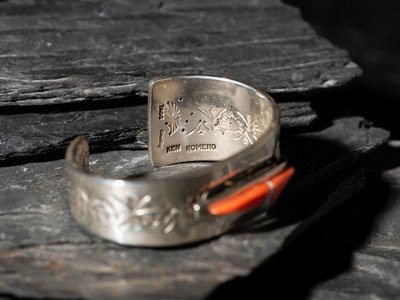 the other with an offset tapered shank, featuring coral and opal inlay; signed KEN ROMERO TAOS and marked STERLING