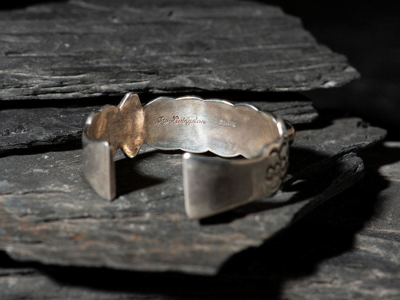 a heavily stamped example with scalloped edges and two offset coral cabochons; signed JAY LIVINGSTON and marked STERLING
