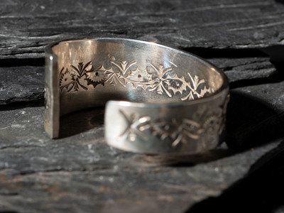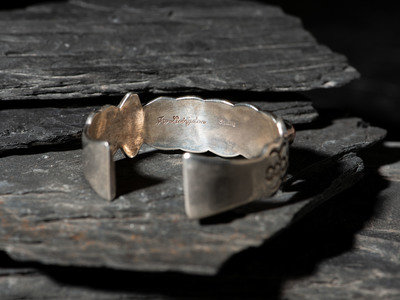 cuff width 3/4 inch, interior circumference 5-1/2 inches x gap length 7/8 inch, weight 26.6 dwt.